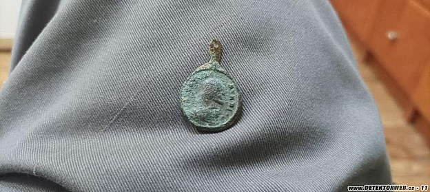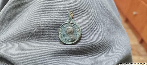 Druhý den jsem se tam tedy vrátil a díra už bohužel nic nevydala, občas probrukuje ale nic. Vedle u dalšího stromu ale krásný signál +80, tak kopu a vypadl na mě ten medailónek, myslím že to svátostka nebude, a také že to bude dost staré. Prosím znalé o radu s tím medailonem. Takže za jeden den 2 x 5 mincí z jedné díry, vlastně 5+1 (5haléř) a 5+1 (medailón). Ještě chci podotknout, jaké jsou to náhody, kdybych neviděl to prase, tak bych nezměnil směr, a tudíž bych stříbrný nenašel.