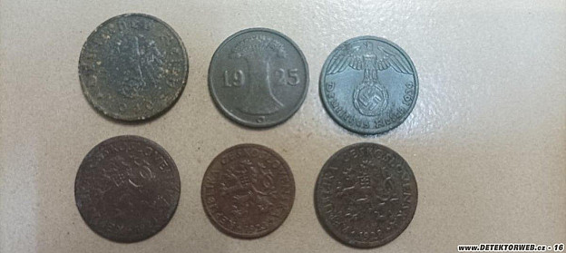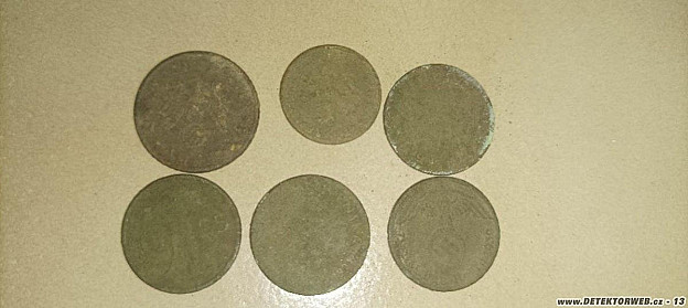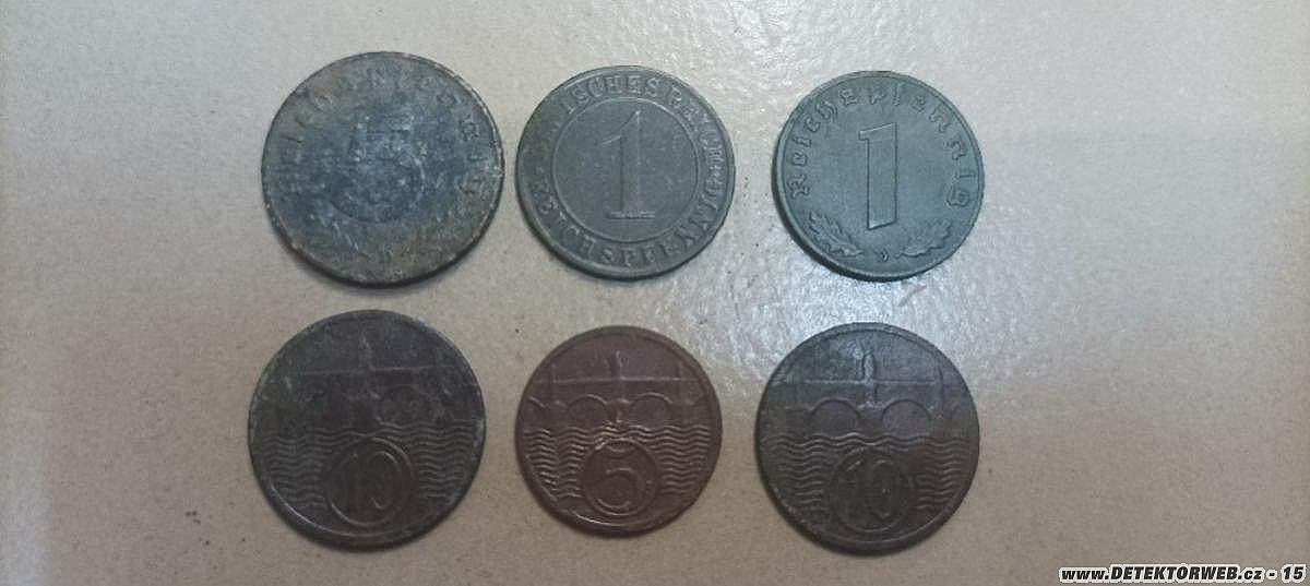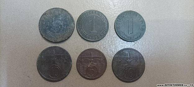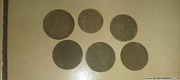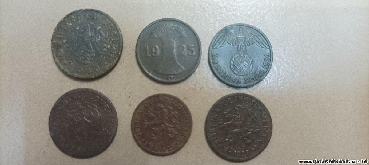 Zdravím všechny slušné hledače, v sobotu 15. ledna bylo velmi krásně, svítilo sluníčko a teplota +10, tak jsem se rozhodl, že půjdu vyvenčit svůj detík. Vyrazil jsem na Berounsko. Zaparkoval jsem auto a vyrazil do lesa. Signály jen občas a pouze bordel. Za půl hoďky jsem došel na starou, ale ještě používanou lesní cestu. A u stromu najednou barevný a silný signál. Kopu a 1pfenik s orlicí a říkám si dobrý, tak to by tady mohly být třeba i marky. Díra pořád zvonila, a tak jsem kopal, padly ještě 1 rentenspfenik, 5pfenik zinek a 2 x 10 haléř první republika, celkem tedy 5 ks mincí a asi 1 metr od díry ještě 5 haléř první republika. Pak jsem ještě chodil po okolí a nic. Šel jsem tedy dál, ale narazil jsem v lese na starou střelnici a bylo to tam zamořené kulkami, tak jsem se vrátil k autu, dal jsem cígo, napil jsem a šel na druhou stranu velkého lesa.Chodil jsem tam asi 3 hod. , drápal jsem se do kopců (Berounsko je samý krpál) a vůbec nic, tak jsem se začal vracet. Asi 200 metrů před autem jsem u cesty potkal hledače. Bylo mu asi kolem 50ky a měl detektor XP, já mám Fišera. Prohodili jsme pár vět, říkal, že je přímo z Berouna a že chodí hledat už asi 5let a že Beroun a blízké okolí už má dost projité. Jsem válkař, tak jsem se ptal, jestli nenarazil na Němce a on že ne, pouze prý nachází ztracené mince. Tak jsem se ho zeptal kolik už má stříbrňáků? Prý za celou dobu, co chodí hledat, tak má 12 ks a já mu říkám, jaké má nejstarší, jestli našel ňaký groše a on že nejstarší stříbrný má z roku 1850.Povidal jsem mu, že jsem našel kdysi pár stříbrných grošíku asi 15 km od místa, kde jsme stáli. Byl to mincičkář, ale prý se mu středověk vyhýbá.