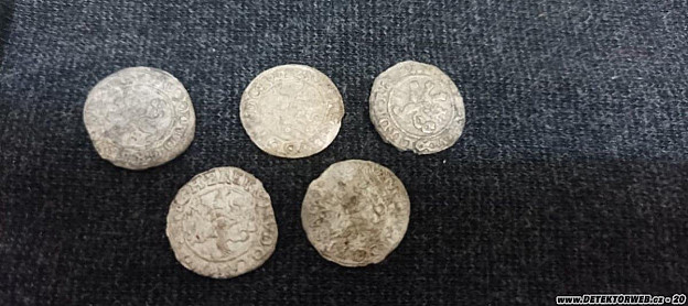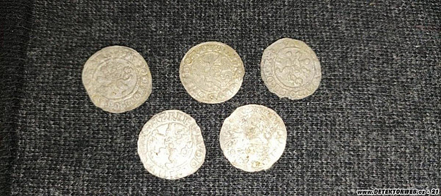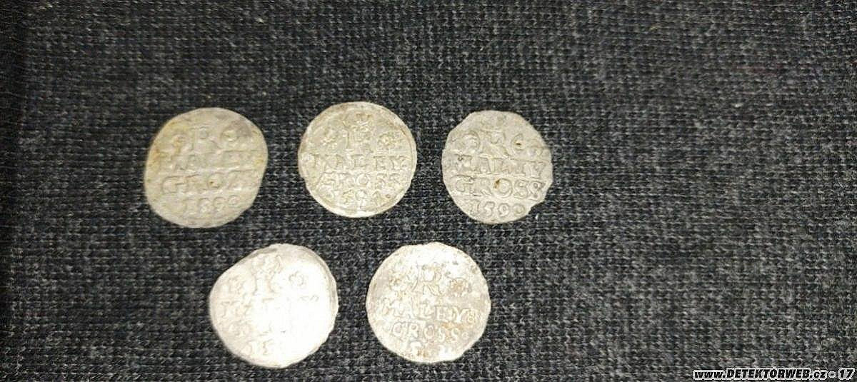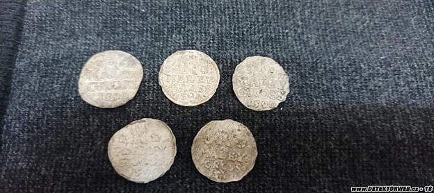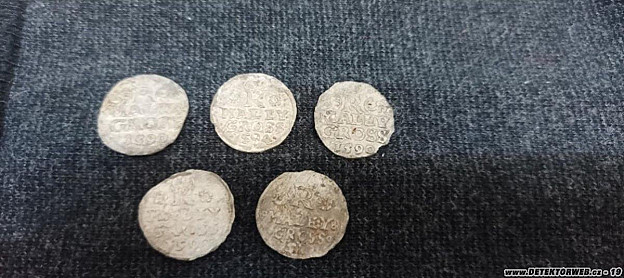 Tak jsem tedy kopal a za chvilku koukám a mám v ruce malý plíšek, říkám si, že by stříbrňák? Na čištění nebylo čas, protože se začalo šeřit, a také kdyby to byl, tak bych to mohl čištěním v ruce poničit. Díra ale zvonila dál, tak jsem postupně vytáhl ještě 4 ks stejných velikostí. A pák jsem musel rychle k autu, protože tma byla neúprosná. Doma jsem lehce kartáčkem pod vodou očistil a koukám stríbrňáky. Malej groš 1590, říkám super, hurá! Večer jsem nemohl ani spát, protože jsem se těšil na zítřejší dohledavku. Přemýšlel jsem, jestli tam byla kdysi stará cesta, nebo jestli tam dřív nebývalo středověké tržiště.