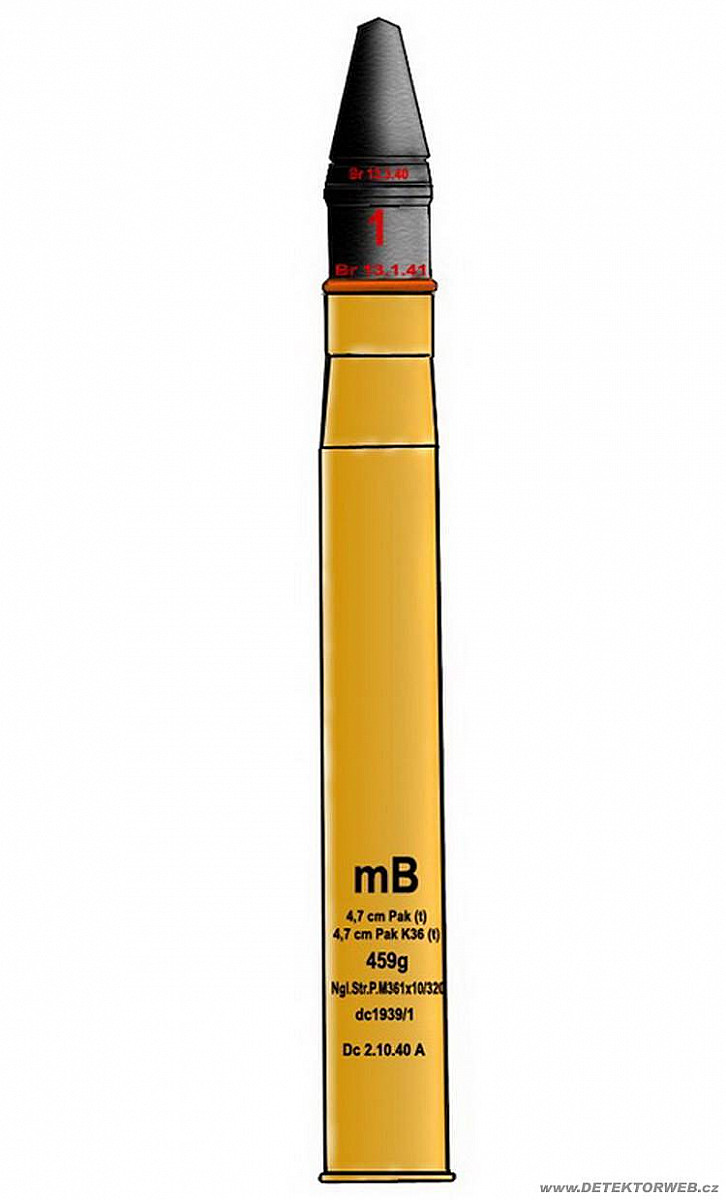 Nábojnice M36 značena 4,7 cm Pak (t) což značilo munici vyrobenou v předválečném Československu je plněna nitroglycerínovým prachem (459 g Str. P. M-36(1x10/320). má olověný drát (mB) a má mechanický zápalkový šroub M33.