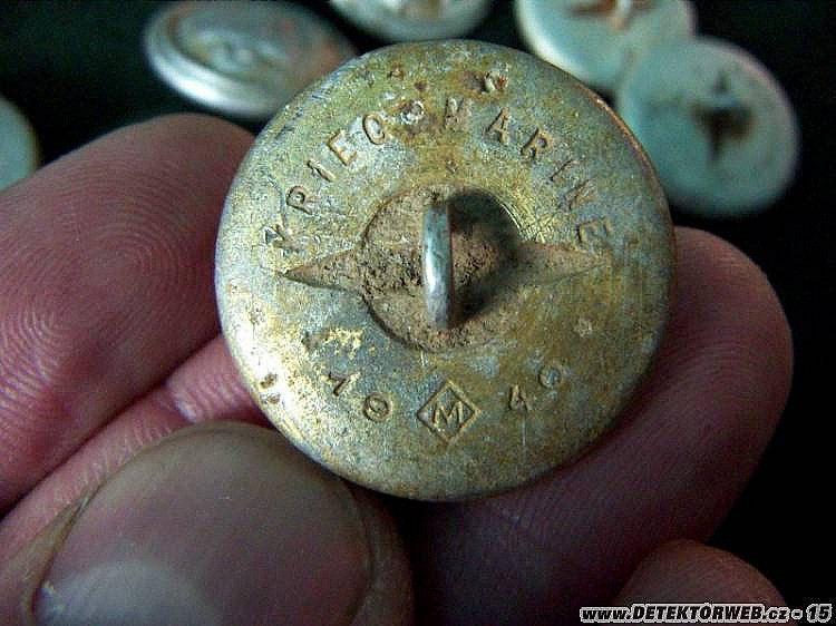 Posílám ke shlédnutí 60 kousků knoflíků WW2 Německo-KRIEGSMARINE. Každý rok se jich pár připlete pod cívku mně, nebo kolegům, tak jich zas pár přibylo. Materiál na výrobu knoflů, byl zřejmě zvolen podle toho, jak válka materiálově vyčerpávala německý průmysl. Zatímco na začátku války byly knoflíky z plného a těžkého hliníkového odlitku s vyraženým mariňáckým motivem, postupně se přešlo na dutý Al. korpus a následně pak na obyčejný elox. železný plech. (viz. zkouška magnetem). Zajímavý je i kousek vyrobený ze skla z r. 1942.Výrobce J. F. S. (Josef Feix Söhne) z Jablonce n. N. v RZM kódech pod označení M9/208.Vzhledem k&nb sp;tomu, že se zde na západě našly i nějaké mariňácké ID známky, vypadá to, že tyto jednotky byly na konci války nasazovány i do pozemních lokálních bojůvek s amerikány, ke kterým pak houfně a dobrovolně prchaly do zajetí. Ať tak, či onak, každý nalezenec KM vždy potěší. Na poslední fotce uvádím příklad použití malého KM knoflíku na výložkách.