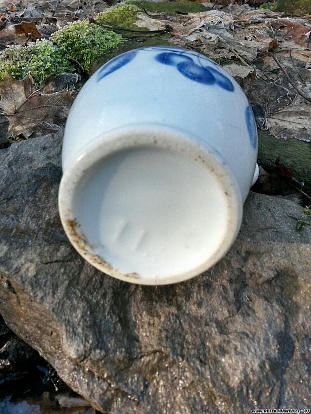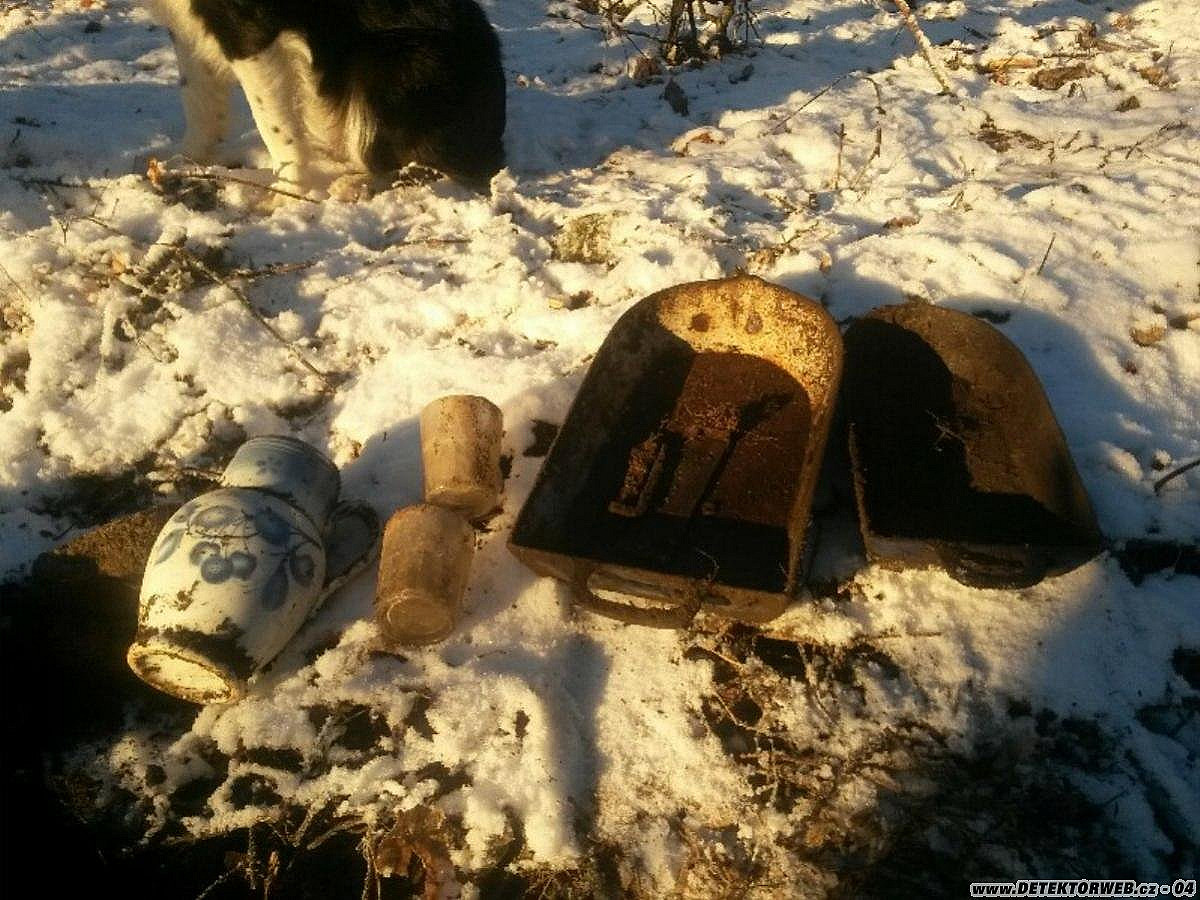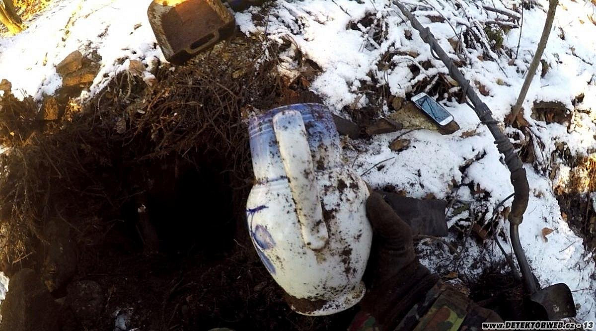 den před koncem roku 2016 jsem se šel projít. Vyrazil jsem brzo ráno, abych stihnul východ slunce a zadařilo se. Po pár signálech přišel hezkej signál v hromadě kamenů. Po pár odendaných kamenech na mě vykouklo dno litinovýho pekáče a to už jsem tušil, že jsem na dobré adrese. Začal 45 minutový maraton v přemlouvání kamenů a kořenů, jelikož po tolika letech si to hezky sedlo. Oba litinový pekáče byly dnem vzhůru a šikovně zachycený uchama pod kamenama, a to všechno jistil super kořen, kterej jsem nechtěl sekat. (Konečně jsem zužitkoval pár let prosezenejch na zachodě s digitalnim tetrisem :) ) Když už jsem se po několika marných pokusech rozhodl šáhnout za pekáče motykou, vyvstala myšlenka tam nejdřív hrábout rukou. A dobře jsem udělal, vykoukl na mě krásně malovaný džbánek, který nebyl rozbitý. Což ještě víc ve mě utvrdilo myšlenku, že nádobí zde bylo uloženo a ne vyhozeno. Džbánek byl oběma pekáči překryt schválně. A nešel jen tak vyndat, což ve mne vzbudilo hezkou adrenalinovou myšlenku, že obsahuje něco zajímavějšího. Bohužel tanec hula hula se nekonal, obsahoval dvě neznačené sklenky, ale džbánek mě velmi potěšil. Odhaduji vzhledem k historii zaniklé obce, že džbánek a ostatní nádobí bylo uloženo někdy v letech 1945 - 1948 před odsunem. Vzhledem k nálezu několika debordelizačních jam v této oblasti, kde porcelán vypadal zcela jinak. Pekáče mají označení velikosti a jsou značeny značkou Pilsen, čili Plzeň. Po cca. 60 letech vykoukl džbánek zpět na svět, slouží na chaloupce a dělá radost. Při svitu ohně z krbu, který džbánek na dubovém stole osvětluje, mi jdou hlavou myšlenky, kde sloužil, kdo ho používal a komu dělal radost. Jsem rád, že se mi podařilo mu vrátit jeho duši.