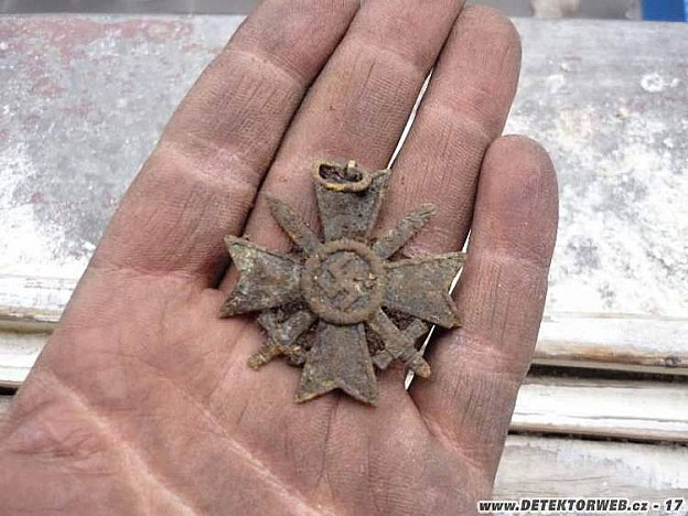 Bylo tam černý za zranění a železňák 1.tř se šroubením (patrně 1.válka? nevím). Pak už nic, i když jsem to tam s tátou schodil. Rozhodli jsme se, že se posunem o něco dál ve stejné lokalitě. Po půl hodině v lese našel táta pod svahem mrakomora a už to lítalo kousek nad ním stužkovačka u pařezu. Ovšem u pařezu byl ještě jeden tón. Kopu jak divej a šup na světě byl další mrakomor, ale s polovicí věnce ratolesti. U toho stejného pařezu ještě takovej slabej, ale čistej tón. Kopu, kopu a z velký hloubky vyndavám železňák 1.tř. se sponou v té stejné díře byla ještě spona za boj z blízka a torzo stříbrnýho za zranění. Táta ještě kopnul záslužák asi deset metrů od tohohle místa a opět v pařezu. To bylo vše. Pak jsme si uvědomili, že jsme to nenatočili. Hold nám adrenalin zamlžil paměť :) Škoda!!! Byla by to pecka. Jsme rádi, že máme zase nějakou lokalitku, protože poslední dobou už jsme nevěděli kam vyrazit. Na fotkách nálezový stavy a stavy po opláchnutí vodou. Je jasný, že stavy jsou v pr... , ale adrenalinek byl parádní. Až všechno vyčistim pošlu fotky jak to dopadlo. Kdyby jsme chtěli pěkný kusy, tak půjdu na burzu. Tohle je koníček a mi si ho užíváme na 100procent, což je na videu vidět. Radujem se z odznaku, kterej jsme kopli v řádu desítek jako by to byl první. A o tom to je. Pobavit se, odpočinout si, vyadrenalinovat se a hlavně vypadnout z toho hnusu, co je všude kolem v naší malý zemi. Přeju vám spoustu stejných a lepších zážitků. Lovu zdar!!! kajman1