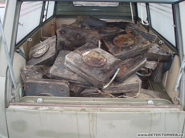 Ahoj mrcasníci, posílám Vám fotky ze zvláštního nálezu. Již několik let jsem chodil okolo bývalého vojenského cvičiště. V polorozpadlém domečku se válela hromada čehosi, co snad vypadalo jako miny, ale bylo to vyrobené z gumových pásů. Jak je známo, gumu ve sběru neberou, takže magneti to nechtěli. Nedávno jsem jich pár posbíral a fotky poslal pyrotechnickým vojáčkům s dotazem, vo co de. Byl jsem pak mile překvapený, snad více než vojáčci, že se jedná o cvičné miny USA M-19. Ani vojáčci nechápali, kde se na Doupově tato mina v takovém množství objevila. Zřejmě se vojáčkům po cvičení nechtělo uklízet, vždyť kdo by se s tím tahal. A jelikož se v mém Válečném muzeu Sudety každá věcička hodí, nastartoval jsem dvanácettrosku a pracoval jak dělnická třída a ekologicky vyčistil les. Jedna mina váží 13 kg a v té dvanácettrosce jich bylo naložených 101. Chytli mě policajti, miny jim nevadily, ale zjebali mě za modrý maják na sanitce. Celkově jsem těch min nalezl 218, takže pokud někomu chybí ve sbírce, napište mi na muzeum@jmsieber.cz, klidně jich několik vyměním za něco jiného do muzea. Přidávám pro ilustraci foto pravé miny.