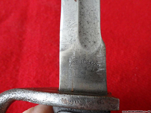 Čepeľ bodáku má po odstránení píli trochu komický tvar, avšak ostrie čepele je bez brúsenia a bez zásekov. Na chrbte čepele už vidiel len čiastočne značenie, ktoré bolo vyrazené po odstránení píli. Čepeľ je značená až 2x, čo je zaujímavé. Na jednej strane je nápis „H. KOELLER, OHLIGS, SOLINGEN“ a na strane druhej „DURKOPP WERKE A. G. “. Drevené črienky už lepšie časy zažili, ale ich tvar a prevedenie je stále zachované. Žiaľ uzamykací mechanizmus sa mi nepodarilo uvoľniť ani napriek množstvu WD 40 a dlhej snahe s gumeným kladivkom – no nič na pušku ho aj tak dávať nikdy nebudem, lebo ju nemám...:-) Puzdro je plechové, s drobnými stopami po korózii a má aj dve preliačiny. Mnohí zo zberateľov majú tento typ bodáku určite v lepšom stave a možno by si ho do zbierky ani nezaradili, ale mne sa páči jeho stav a to, že určite videl nejednu akciu počas vojny.