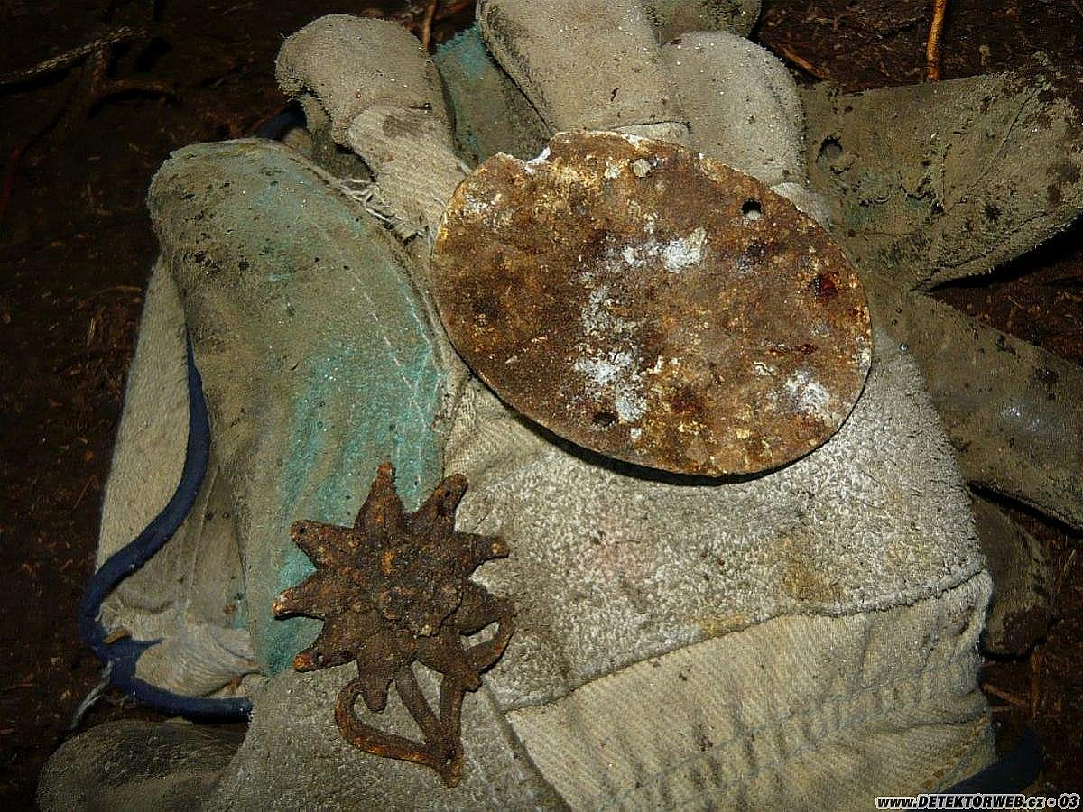 Zastavil jsem na tom místě a vydal se vstříc větru a dešti. A už za chvilku se ozvala sežraná hliníková ID známka a s ní v díře jedna plechová protěž alpská a k tomu zpuchřelý kondom. Celkem zajímavá kombinace. Po focení jsem máchnul nad místem nálezu a můj věrný Garrett říkal, že tam ještě něco bude. A bylo. Další 4 protěže, 4 kropenaté knoflíky, cáry uniformy a 2 kusy kůže ve tvaru půlměsíce. Bohužel padla tma a baterky v čelovce někdo zapomněl nabít. Na místo se budu muset ještě vrátit kvůli dohledávce.