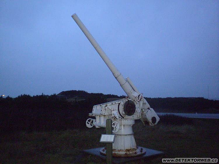 Baterie Hanstholm-10,5 cm kanon, snad půjde vidět... je před vjezdem do areálu musea, které bylo zavřené. Naštěští Dánové mají pěkný zvyk, že na všech zajímavých místech mají schránky, ve kterých jsou letáky v několik jazycích. Tak jsme vzali leták s mapkou a areál prolezli za šera a tmy....