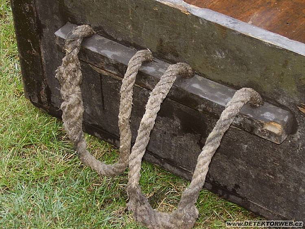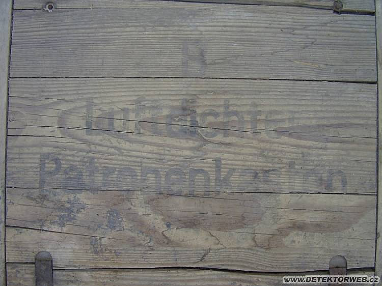 Prvá je nemecká vzduchotesná drevená debnička na muníciu do pištolí. Z nálepky, ktorá je už trochu poškodená, sa dá vyčítať, že ide pravdepodobne o kaliber 8 mm. Rád však budem opravený a privítal by som akúkoľvek informáciu aj o akú pištoľ ide. Jej rozmery sú (d-š-v) 48,5 x 35,5 x 18 cm. Dúfam že číslo 1944 na nálepke naozaj znamená rok a nie nejaký bezcenný údaj.