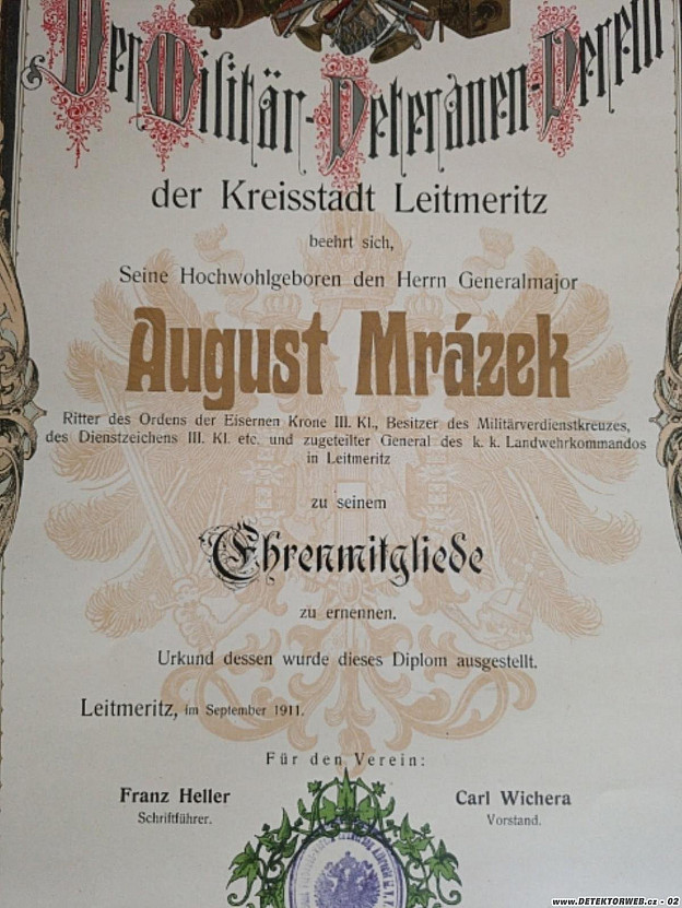 28. 07. 2022, 15:11V roce 1911 byl tímto Diplomem jmenován Čestným členem Spolku vojenských veteránů v Litoměřicích. Tehdejší R-U Generálmajor August Mrázek. Za své aktivní důstojnícké služby již dekorovaný Rytířským stupněm Řádu F. J. 1., dále Záslužným křížem s válečnými ratolestmí III. tř. A dalšími mu udělenými vyznamenáními ("etc. "). V době udělení tohoto čestného členství - září 1911. Sloužil tento jako teritoriální velící generál na Velitelství R-U domobrany v Litoměřicích... (Možná to byl onen, kterému "vstaly péra" na generálském klobouku. Když v hospodě prohlásil ostrostřelec Anton Špelec svou proslulou větu: "Císařpán je vůl! ")