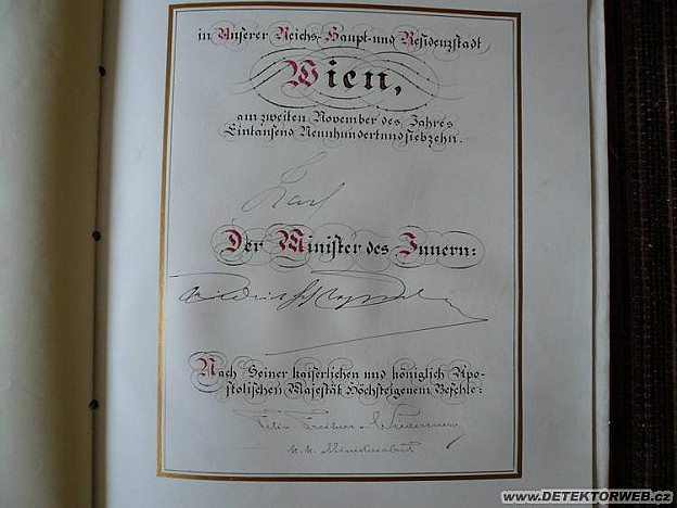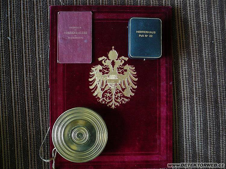 04. 07. 2008, 12:52Je to dekret a legitimace člena horní komory (tzv. Panské sněmovny) Říšské rady (parlamentu) Mikuláše (tedy Nikolause) hraběte des Fours-Walderode. U klíčku k pultu má napsáno - Schlüßel meines Pultes im Sitzungssaal der Herrenhauses=klíč od mého pultu v zasedacím sále Panské sněmovny. Každopádně velice pěkné kousky.