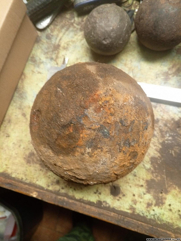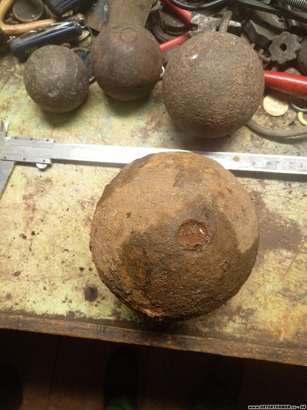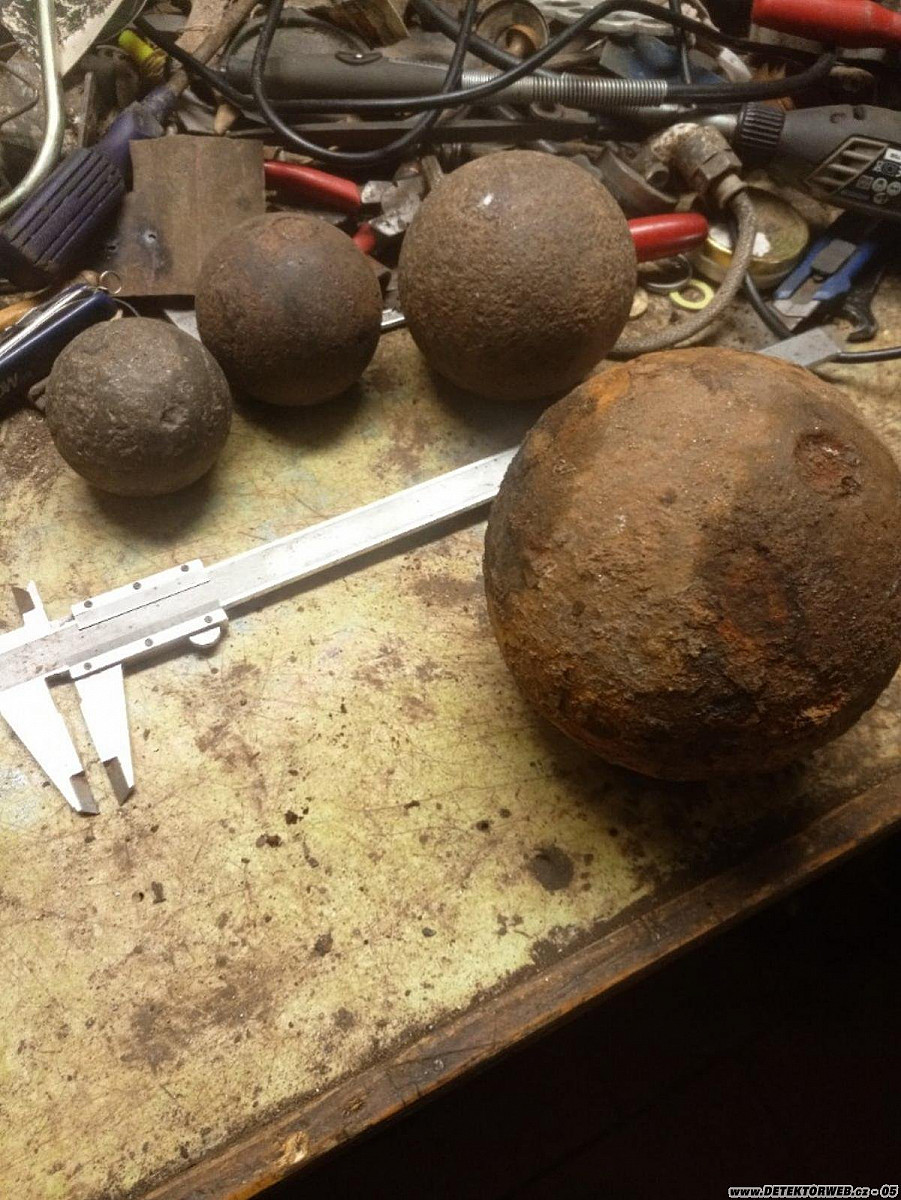 Menší 10,5 cm, váha cca 5-6 kg, ze starý kůlny. Větší 15 cm, cca 12-13 kg (asi 24 liberní kanón), od kamaráda, co jí vybagroval na stavbě. Obě by měly být prázdné, byť se na větší zdá být otvor, asi pozůstatek po lití. Obě pravděpodobně pozůstatek Sedmileté války, sedí na přestřelky Sasů a Rakušáků ve Šluknovském výběžku.DFX