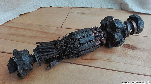 03. 02. 2017, 19:03Ten rotor je z rotačního měniče neboli motorgenerátoru. Ta delší strana se zbytky lamel komutátoru na vinutí je motorová, kratší strana je alternátorová. Ty dva měděné kroužky odváděly vyrobený střídavý proud, jezdily po nich uhlíky. Je to stejná konstrukce jako u altíku v autě. Zbytek gumové mušle je skutečně ze sluchátek, byla zašitá v letecké kukle...