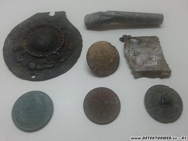 28. 02. 2014, 17:28Na první fotce vlevo dole 2 halíř R. U., maďarskej. Vedle je 10-ti halíř předvál. československo. Ten kropenatej knoflík odhaduju na wehrmacht.