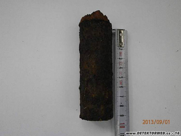 Tak jsem po delší době opět navštívil ten maličký lesík v kterém jsem našel policejní slepičku a část kokardy ( jsou v mých předcházejích příspěvcích) s úmyslem dohledat zbytek. Tentokrát jsem tam ale zašel z druhé strany než posledně a hned to začlo. Každou minutu konzerva, víčka od zavařovaček a podobně. Navíc si tam děti postavily z prken bungry a střílej tam po sobě kuličkama a z plynové pistole, takže k tomu všemu samej hřebík a mosazné hilzny. Prostě hledačský ráj. Tak jsem se tam trápil asi hodinu, ale nakonec přišla sladká odměna. Vše začlo jakousi krátkou železnou trubičkou, pak slabší barevné signálky, z kterých se vyklubaly jakési hliníkové kroužky o průměru 42mm a v pravidelných vzdálenostech asi 15cm. Těch bylo 7 kusů. Poté opět následovala jakási železná trubka s bajonetovým zámkem. Navíc po celé délce jsem nacházel zbytky rozpadlé červené látky a kousíčky černé koženky. No a nakonec silný barevný signál. Po jeho odhalení jsem si jen sedl, dal si cigárko a kochal se. Rozměry jsou 25 x 26 cm. Ať to pípá