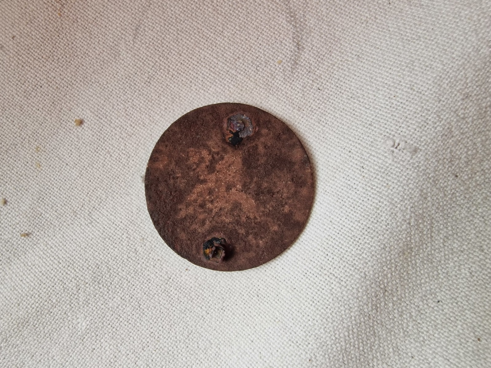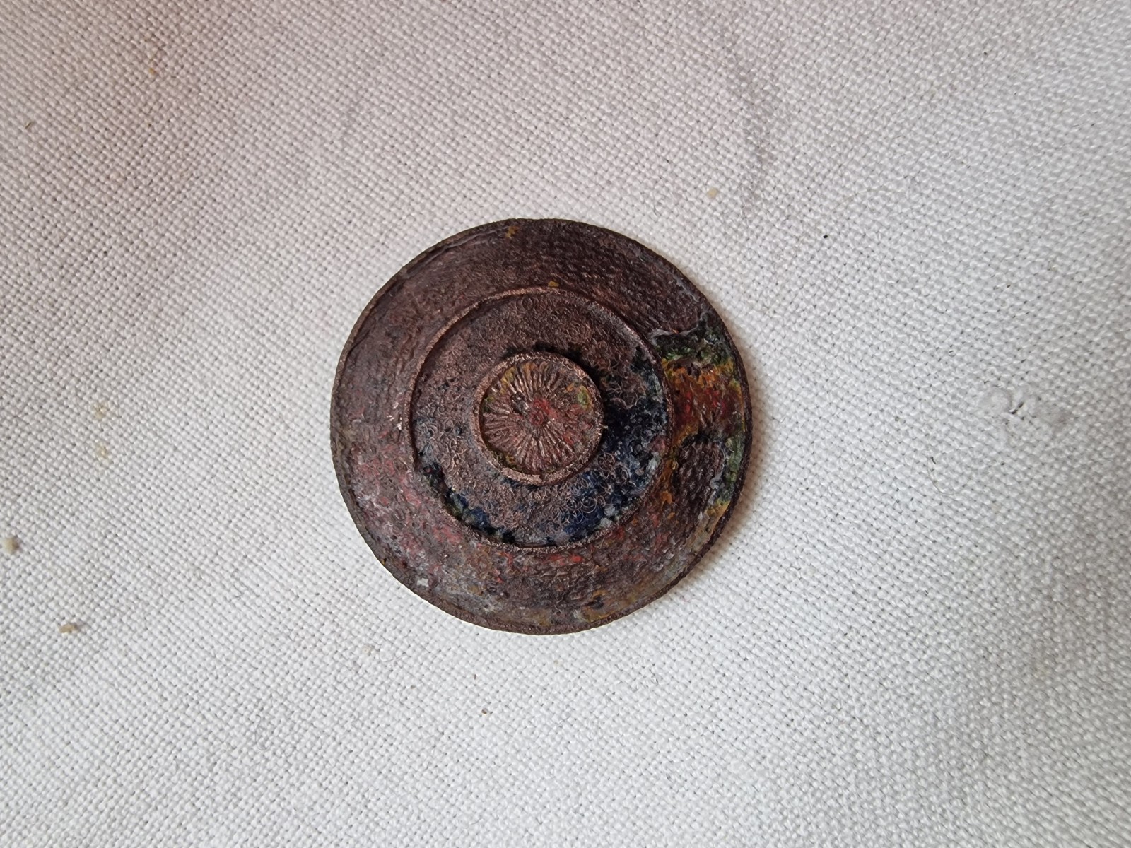 o velikonočním vejku jsem trochu provětral detík na lesních cestách v sudetech na jihu čech. Jeden z nálezů je vprůměru cca 3cm kulatý odznak. Zadní spona se nedochovala. Nevím kam jej zařadit. V jedné z kružnic je malinko zachovalá asi černě zbarvená výplň..
