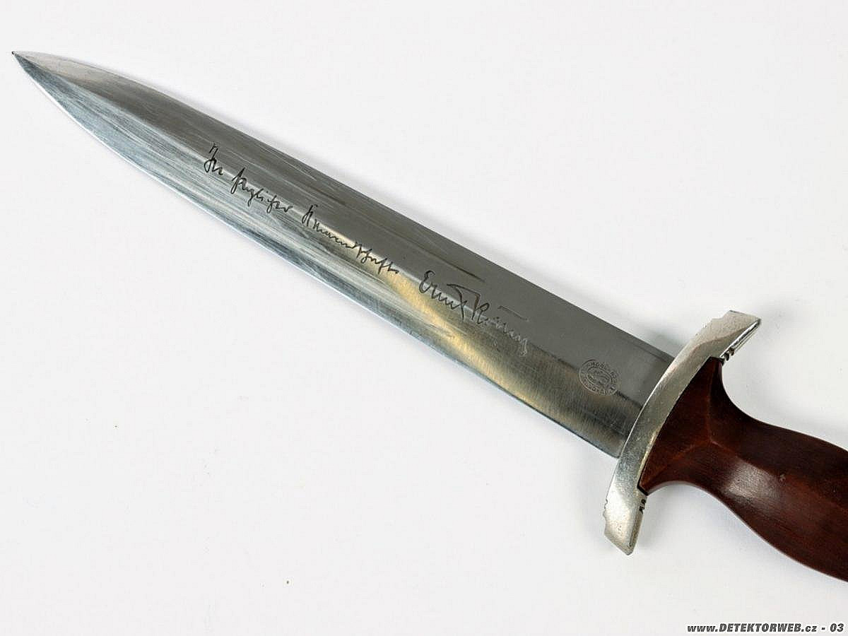 10. 02. 2022, 12:06Asi bych souhlasil s Megim. U většiny těchto dýk bylo jméno Ernsta Röhma vybroušeno po Noci dlouhých nožů. Ernst Röhm bylo po této události sprosté slovo, i když jistě měl dost příznivců i dále, ale souvislost s ním mohla stát dotyčného krk a to asi nikdo nechtěl moc riskovat.