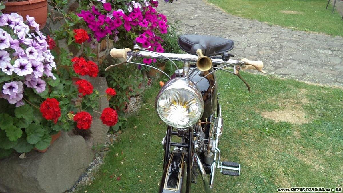 Štítek na hlavě řídítek je potvrzení o zaplacení silniční daně před válkou ve Francii. Snad se vám bude motocykl líbit a nenajde se mnoho rýpalu typu ten bovden měl být na pravé straně a né na levé. Motocykl jsme skládali pro radost z toho, že mu znovu vdechneme život.