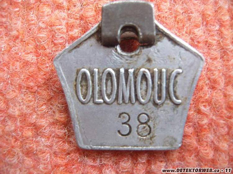 Popis známečky Olomouc s pancéřkem: Známka V. Podivína, líc známky - nápis Olomouc, dole dodatečně vbito pořadové číslo psíka v tom roce čís. 38 (majitel psíka lze dohledat v evidenci obce). Rub-Hlava psa s poloklopeným uchem typu kolie zleva, dole nápis 1950(rok) Materiál hliník, původní míry 29,5x29mm, otvor průměr 3,5mm, váha 1,7g.