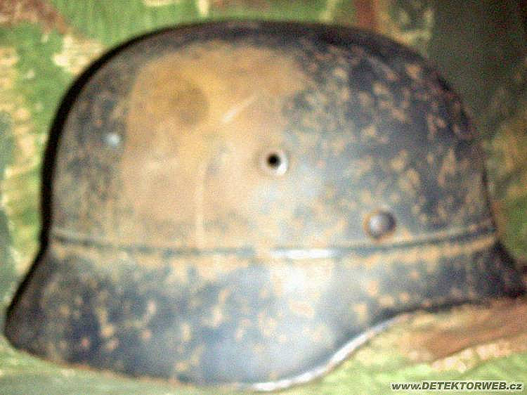 23. 12. 2008, 16:52Je to přilba M 1940 pro luftschutz, prolis po stranách byl určen pouze pro civilní složky, protože nesplňovala bezpečnostní kritéria bojové přilby. Barva je modrá, takže buď Luftschutz nebo pilicie Luftschutzu(tomu by odpovídal i fakt, že je po stranách seškrábaný decal), Volksturm - Sauerland používala šedý nástřik na helmách, takže jednoznačně potřeby Luftschutz. Navíc Volksturm používal standardně přilby M 1934 a nebo M 1942.