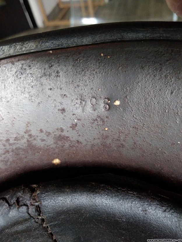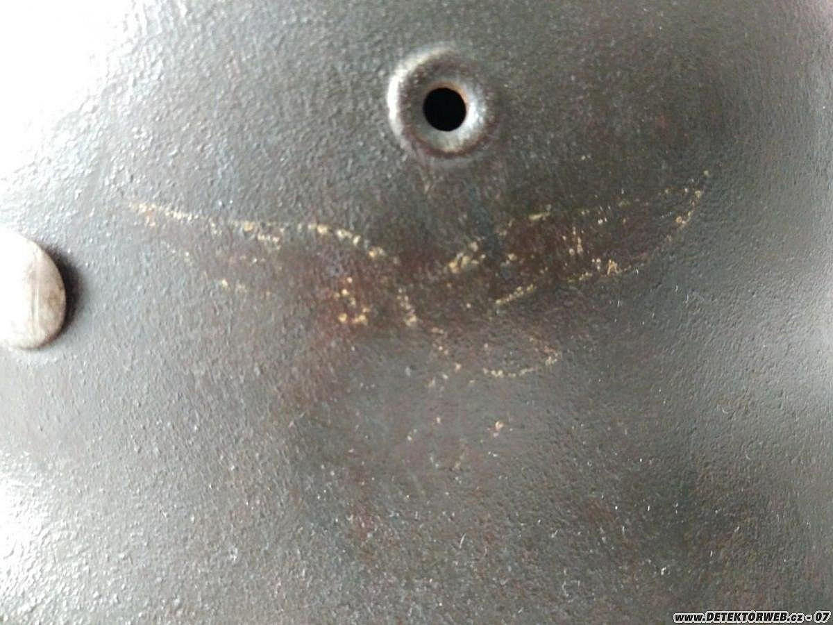 Zdravím kolegové,posílám svojí helmu na čumendu, při nálezu byla celá nabarvená na červeno s tím, že vepředu byla tmavší červenou barvou namalována hvězda, po odstranění barvy vykoukla slípka! Vnitřek je origo, pod ražením výrobce na podbradníku je rok 1938.