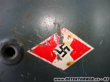 21. 02. 2011, 14:48Model M 1942 s vnitřkem z roku 1940 nepravděpodobné, barva nová a kombinace vojenského dekálu s HJ symbolem je podivná. Trikolora byla zakázána v roce 1940 z důvodu jasné viditelnosti. Pokud se členové HJ účastnili nějaké akce, tak měli buď bojovou přilbu bez symbolů nebo přilbu Luftschutzu při odstraňování trosek a pod.