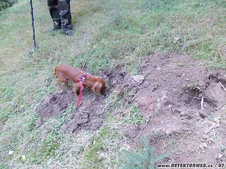 Bohužel stejné místo před náma navštívil i nějaký hledač, který si myslel, že zahrabat svou díru je pod jeho úroveň. Už se nedivím sedlákovi, který mě před měsícem sprostě hnal ze své louky se slovy: "zmiz od tud a nedělej mi tu díry! ". Tak jsem ten den zahrabal víc děr než vykopal.