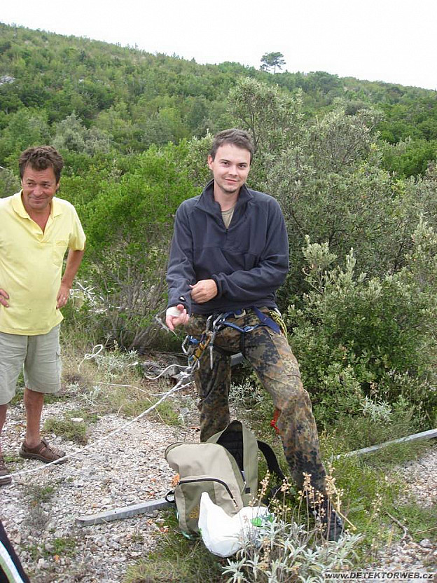 Honza se pomalu spouštěl do temné díry, nebylo to příjemné, nevěděl, co ho čeká dole. Při ústí má jáma tak metr na metr. Sluneční světlo začíná mizet. Po dvou metrech se náhle prostor rozšiřuje a nyní visí na laně volně v prostoru. Svítí baterkou kolem, stěny se rozestoupily na několik metrů širokou šachtu. Dole v chabém světle baterky asi 10 metrů pod sebou vidí nejasně dno jámy. Pomalu klesá. Nahoře slyší hlasy podpůrného týmu. Dundo Baldo, Josip, Ilja a táta. Snad vše dobře dopadne. Pro jistotu škrtá zapalovačem, co kdyby zde byly nějaké nedýchatelné plyny. Plamínek jasně hoří, vše je O. K. Dopadá na měkké dno, fuj, noha se zabořila do mazlavé hmoty, svítí na zem, naštěstí jen staré brambory a spousty bordelu, vedle rezavá lednice, kamna, plastové pytle s odpadem. Vesnice zde má soukromou černou skládku….. Opatrně se pohybuje po nestabilním podloží k nejvzdálenější stěně. Světlo baterky osvítí ohnilou hlavu psí zdechliny, fuj tajbl, uleví si. Pro jistotu opět škrtá zapalovačem, plamének svítí, vše je O. K. U zdi vidí nějaké kosti, ale né, trochu s úlevou a trochu se zklamáním zjišťuje, že jsou z nějakého zvířete. Mise pomalu končí, to co chtěl vidět leží pod několikametrovou vrstvou odpadu, tady nejde nic dělat. Volá k malému světlému otvoru u stropu, „tahejte, jdu nahoru“. Naposled se rozhlédne po červených vápencových stěnách s krápníky a mráz mu přejede po zádech. Už toho bylo dost. Souká se úzkým vstupním otvorem na planinu. Slunce zapadá, je teplý chorvatský večer. Pohlédne do černé díry, otřese se, zaplať bůh, mám to za sebou….