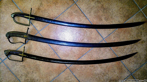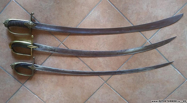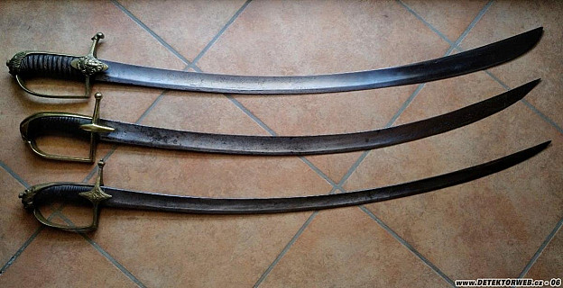 18. 08. 2021, 15:11Prvá s pravej strany anglický husar ryta čepeľ anglický kráľovský erb GR, Napoleónske vojny, v strede francúzsky husar ANIV čepeľ značená na chrbte výrobcom Kligenthal na stranách kráľovská francúzska ľalia, Napoleónske vojny, na ľavo rakúsky husar typ Prima plana čepeľ ryta Turecká hlava a rastlinné ornamenty, napis Omnia vincit amor, Napoleónske vojny, druhá fotka s pravej strany francúzsky husársky dôstojník Perlová garda, ryta čepeľ napoleonskymi motívmi, v strede francúzsky dôstojník tu sú názory že by mohlo ísť aj o námorného dôstojníka druhá polovica 18 storočia, neznacena, neryta čepeľ, mimoriadne krásna a masívna sabla, na ľavo francúzsky husar neznacena a neryta, druhá polovica 18 storočia.