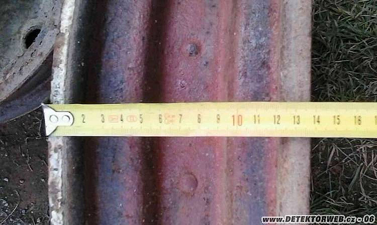 Potřeboval bych poradit s identifikací ešusu, co je vyrobený z ocelového plechu, pájený cínem a jsou na něm zbytky šedozelené barvy. Pak tu mám 2 kola o průměru 16" a otvory pro 5 šroubů. Poslední je jakýsi majzlík s V ostřím.