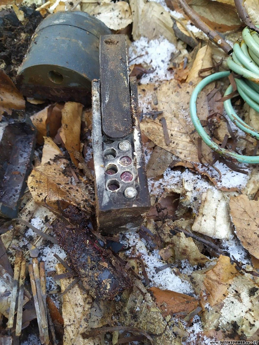 Zdravím. Tak po nějaké době přispěji svou troškou do mlýna :-) Nedělní návštěva Sudet probíhala tak jak to asi všichni znáte. Signálů pomálu, člověk si aspoň užívá ten klid v lesích, dál od vesnic, lidí. Padlo pár mincí, psí známka, fajfka. Pozdě odpoledne jsem narazil na kamenitý svah se skalisky kousek pod vrcholem. Říkám si, tam to musím zkusit. Hned pod prvním skaliskem signál jak kráva. Po odkrytí si říkám, kur-a je to tady. Na uklidnění jsem zapálil starťáka bez filtru :-) Pak si říkám, může tam být cokoliv, tak opatrně. Vytáhl jsem kastlík, položil na bok a radši jsem to otevřel zespodu. Objevila se rozmočená kulatá lepenková pixla, vedle ní druhá, v obou nějaké mokré sajrajt. Vytáhl jsem to, objevily se něco jako dráty. Ve chvíli, kdy jsem je vyndal, se vykutálelo vajíčko, a bylo po sudeťáku :-) Vevnitř zůstaly ještě dvě, všechny rezavé jak Bystrouška. No a zbytek vidíte na fotkách. Kolega Klarkon mi poslal info, co by to mělo být, tak bych ho když tak poprosil, jestli by to nepopsal ještě jednou tady v příspěvku, abych něco nezvoral. Řeknu Vám, takhle jemně jak při vracení kastlíku zpátky do díry jsem se snad nechoval ani k přítelkyni :-) Položil jsem nahoru velké placák a zakryl listím. Jelikož se začínalo stmívat, tak jsem to hlásil až druhé den ráno. Hlídka úplně v pohodě, pro pyrotechnika terén na Pikaču. Navečer mi volal operační kvůli doplnění oznámení, tak mi řekl, že to bylo odpáleno na místě. No a bylo definitivně po sudeťáku...Tak se mějte a hlavně opatrně. Není všechno zlato co se třpytí...:-)