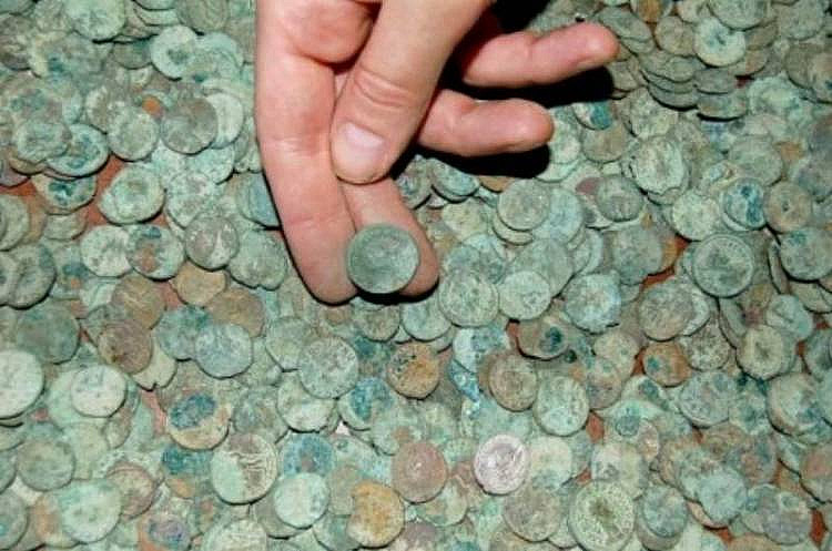 Bohužel všechno krásné jednou končí i já jsem se z krásného snu musel probudit... Ráno jsem si udělal kafe, zakousl koblihu, sedl do svého Hummera H2 a odjel na vysněné políčko. Během pěti vteřin smontoval teleskopickou patentovanou tyč XP Deus a začal zmíněné políčko prohledávat. Opravdu se urodilo, po prvních pěti minutách první "goldík", prsten a pak to přišlo. Na zlatém řetízku osm masivních zlatých prstenů. O metr dál na mě vykouklo hrdlo nádoby. Srdce mi bušilo. Jedním okem jsem nakoukl dovnitř. Bylo tam pár kamenů a hlíny. Velké překvapení jako ve snu! Bohužel jsem nenašel velké tolary ani dvoutolary, džbánek byl plný malých římských mincí. Věřte, nevěřte, přes 52tisích kusů.