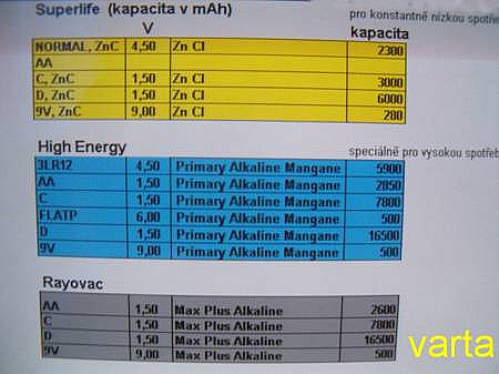 Výrobci na bateriích neuvádí kapacitu, takže ji podle typu hledáme u výrobce, popř. ji uvádí i někteří solidnější prodejci na internetu, je jich však pohříchu jen pár. nebo se dotážeme přímo výrobce nebo jeho zástupce u nás. Obávám se, že prodejce za pultem nás touto informací asi nepotěší. Je zarážející, že u spousty baterií se uvádí jejich vynikající kvality, ceny vysoké, ale tento údaj chybí. A zákazník se spíše řídí cenou, než nábojem a tuto informaci nepožaduje, nakonec spousta jich ani netuší, že něco takového existuje. Takže napřed na internet, najít si vyhovující typ a pak teprve do šopu. U jedné baterie se tak dozvíme:Silná energie pro spotřebiče s vysokým odběrem a Atraktivní design. Tak jsem si o tuto informaci musel CZ zástupci napsat.