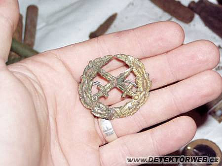 Na zaciatku nasej cesty nas vytala pocva na bodak vz 24 a jedno RG42 bez poistky ktore bolo len v listi a tak putovalo,, hlbsie do listia, , po dakej chvilke sa nam zacali hromadit aj naboje a nabojnice zmiesanej vyroby. Na jednom peknom mieste za starym dubom som nasiel 35 nemeckych nastastie mosadznych nabojov a meter od nich sa valala hromadka nabojnic do spagina, tak asi chudak nestihol ani vystrelit. . Dalej ma postretla gulka do 12.7 ruskej pusky a cca po piatich metroch aj dve nabojnice, asi mal chlap zle nastavene mieridla:o Na zaver akcie sa nam podarili asi najlepsie nalezy dna. Pri velkej skale sme nasli potrhane kusy z prilieb VZ32 cca 3 prilby podla najdenych kusov s uchytmi na remienky a pri nich odznak na Slovenku brigadirku a 10cm od nej dake Zameriavacie ufo ktore vam posielam na identifikaciu. Obdalej sme nasli plynovu masku z ktorej sme nasli filter na zaciatku nasej tury:D A jedno vecsie ufo jdna sa o Amorfne tvarovane teleso... Na detektore mi ukazovalo Mosazd, nikel a coin..?? nevete co by to mohlo byt?