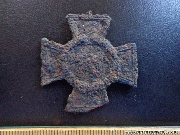 taťka se mi toulá už 4 neděle po Francii, tak jsem si vyšla znovu na rybníček, kde jsme s taťkou byli před měsícem. Sice byl od hledačů rozoraný, ale ještě jsem si něco pípla. Na netu píší, že ten kříž dostávaly rodiny padlých na frontě? Škoda, že je ze železa.
