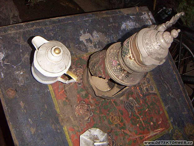 08. 01. 2009, 12:56na truhle je rok 1871 ručně malovana. pěkna je i ta lahev se štitkem a saček je na něm Tropau a uvnitř vata. Taky tam byly obrazy a noviny rok 1944 ofotim je a pošlu.