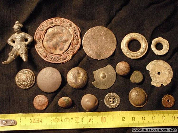 Knoflíky - 18, 18, 19, sels. kroj. ars. br. štítový ze 17 a 18 století, ten plný je ze 17 st. , mystička nevím jest-li je knoflík, ale připomíná mě to závaží, tovelké olámané kolečko se středovou dirkou nevím, snad torzo ciferníku.
