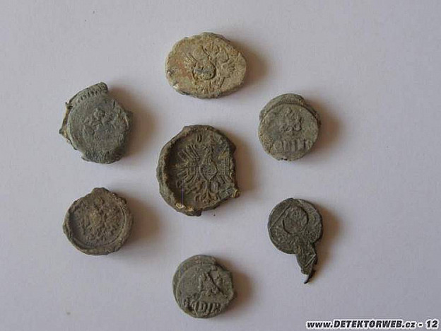 Posílám fota několika lepších knoflíků, které mi uvízly pod cívkou (období RU, livrejové a štítové (ale rád si nechám poradit)). Zajímal by mě původ tří malých knoflíků (průměr 14mm), na kterých je vyobrazen panovník na koni. Dva na drátku a jeden samotný jsem našel každý u jiné dědiny... A zatím poslední knoflík jest zřejmě RU pluk číslo jedna (průměr 22mm), ale to zpracování mi příjde relativně staršího data výroby... poradí někdo? Třeba Jezero??? :-) Zajímavá je i plomba na které je asi ježek nebo bůhví co to je...