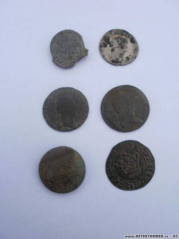 Vpravo dole máš bronzový početní peníz z Francie ražený za krále Karla VI. Šíleného (1380-1422), typ Mitchener 460: