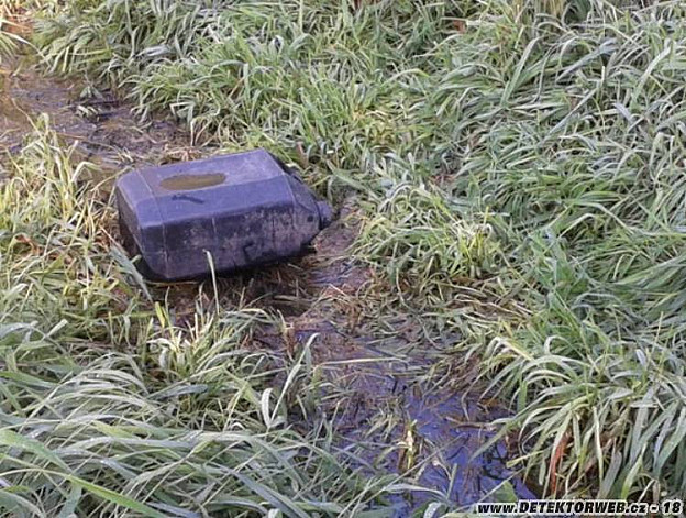 Místní políčka jsou od sebe oddělena různými remízky a kanálky, a tak mě napadá, že bych si mohl udělat malou zacházku a prozkoumat jedno pole, které je za pár keříky a hustým rákosím hned vedle. V trávě vidím prošlapanou cestičku a tak se po ni sunu dolů ke středu kanálku. Cestou jsem do něj párkrát nakouknul a moc vody v něm nebylo a na některých místech byl úpně suchý. Tady na pohled trošku vody je, ale mezi oběma břehy leží plastový kanystřík (přesně na mezikrok), asi aby se nenamočila ani podrážka, a tak jsem na něj s důvěrou vstoupil… a propadl se až po prsa do blátivé smradlavé břečky!!! Cigareta mi odplavala, lopata zmizela někde v baně, z detíku upadla jednotka (naštěstí na protější břeh) a napnutý drát od sluchátek mi schodil čepici a skoro uřízl ucho. Prostě katastrofa.