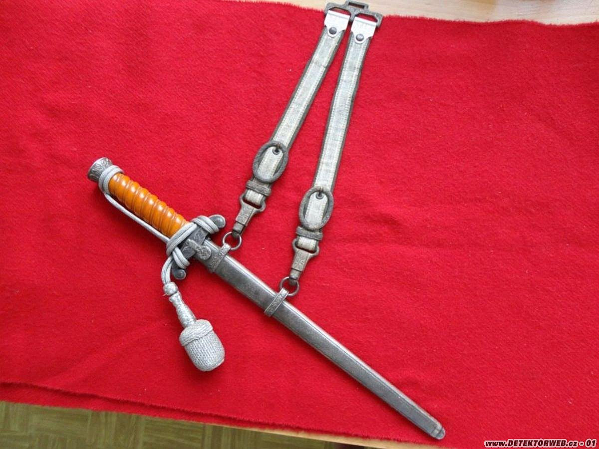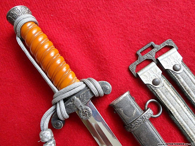 Ak zberateľ pozná jednotlivé charakteristiky, výrobné varianty toho-ktorého výrobcu, má oproti ostatným veľkú výhodu, pretože môže využiť neznalosť iných vo svoj prospech. Výhoda spočíva v tom, že môže kúpiť vzácny kordík, za cenu bežného. Ale späť ku Weyersbergovi, vskutku išlo o pomerne veľkého výrobcu, ktorý bol úspešný najmä pri zabezpečení zákaziek pre Luftwaffe, pretože pre túto zložku armády vyrobil veľké množstvo chladných zbraní, avšak už od začiatku nebol úspešný pri výrobe kordíkov pre wehrmacht. S kordíkmi werhmachtu od Paula Weyersberga sa stretávame veľmi málo, skôr výnimočne. Z tohto dôvodu je cena bez ohľadu na variantu veľmi vysoká a zberatelia si sú ochotní priplatiť 2x viac ako za bežný kordík. Vzácne výrobné varianty od Weyersberga sú potom aj 3x drahšie! Kordík, ktorý môžete vidieť na fotografiách je typ 2. Horná a spodná záštita sú vyrobené z ťažkej zinkovej zliatiny, striebrenie je veľmi silné a zachované na 100%. Horná záštita nesie známky ručnej práce, kedy každý jeden lístok je finalizovaný ručne, rovnako aj žalude a priestor za listami. Spodná záštita je modifikovaný typ od spoločnosti E. Pack – konkrétne typ 3 (pozn. Práve o kordíkoch od spoločnosti E. Pack typ 3 bude v Detektorrewue článok). Avšak aj napriek tomu, že ide v podstate o modifikáciu záštity od iného výrobcu, považujeme tento typ za samostatný návrh, kvôli viacerým jedinečným atribútom. Povšimnite si prosím oko na orlici – má typický Weyersbergov „unavený výraz“, pričom mnohí zberatelia tento typ záštity nazývajú aj „kyklopie oko“. Rúčka je na tomto kordíku úžasná, je to typ „B“ a má z prednej strany sýto oranžovú farbu, na druhej strane je rúčka sfarbená dožlta. V tomto smere ide o veľmi kvalitnú rúčku, pripomínajúcu skôr cukrík, ako plastickú hmotu. Kvalita čepele nezaostáva za celkom, pretože je v krásnom stave, bez jediného fľaku, škrabanca prípadne stôp po zasúvaní a vysúvaní. Čepeľ je poniklovaná a značená výrobcom. Zobrazené značenie je 2. typom značenia, ktoré Weyersberg používal. Dovolím si upozorniť, že niklované čepele sú u kordíkov Wehrmachtu veľkou zriedkavosťou a každá je veľmi vzácna. Puzdro je typickým produktom Weyersberga, je silne striebrené a prstene na ňom sú dorábané ručne. V tejto súvislosti by som Vás chcel upozorniť na jeden naozaj špeciálny atribút Weyersberga. Všetky jeho puzdra majú v hornej časti z obidvoch strán výrobnú vadu, ktorá je postrehnuteľná v podobe malého kanálika medzi bodkovaním, resp. tepaním puzdra – ide o jedinečnú záležitosť, ktorá patrí iba Weyersbergovi. Samozrejme Weyersberg posunul svoje puzdra ako polotovary aj iným výrobcom a vďaka tomu môžeme vybádať, kto bol v danej spoločnosti subkontraktorom. Kordík dopĺňa k nemu patriace portepe a De-Luxe závesník – tieto časti ku kordíku patria od vojny a nikto ich tam nedodával dodatočne. Kordík nebol nikdy očistený a nikdy ho nik nerozoberal.