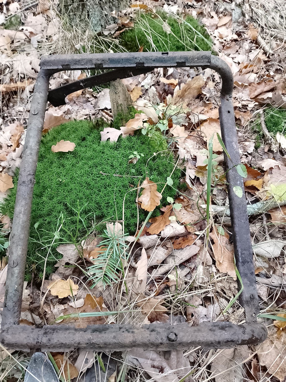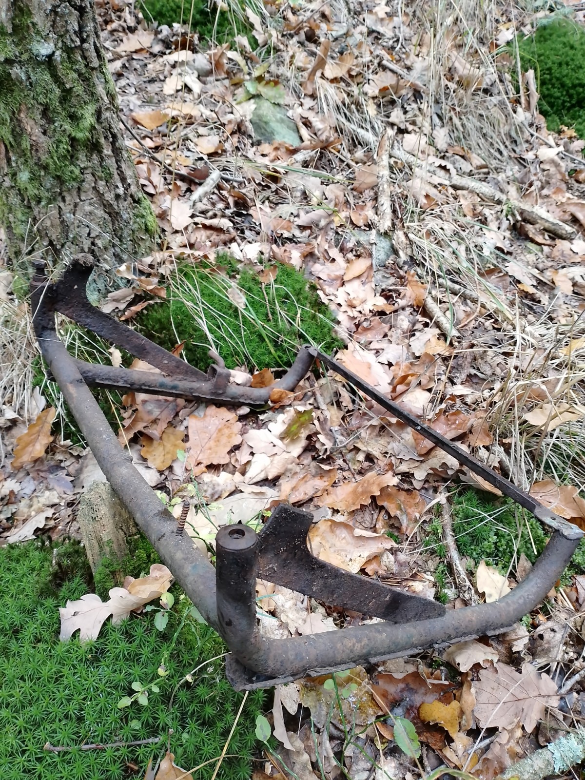 Ač se zajímám zejména o vergly, toto je mi záhadou. Kostra sedadla s lyžinou na posun? Nějaký zemědělec? Vrut v tom na šlic, na něm ještě kousek dřeva s koženkou (upadlo a nevyfotil jsem bohužel). Nalezeno v místě, kde je válečný šrot všeho druhu. Čímž bych poprosil i o identifikaci dalšího, je-li možno prosím. To někdo vyhrabl již přede mnou a možná se sedákem ani nesouvisí. Vím, že je to šrot, ale i tak mne zajímá. Děkuji