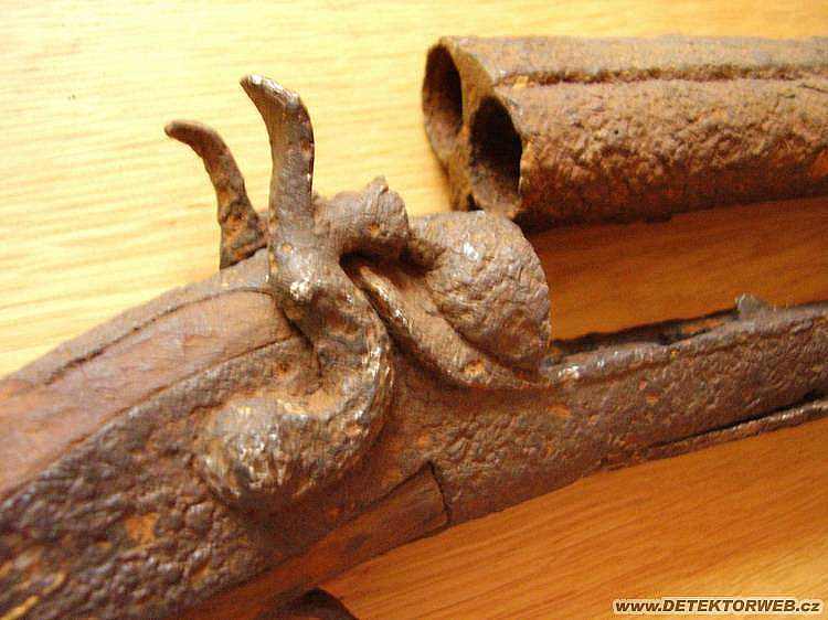 Na dalších fotkách je myslivecká dvojka, nenašel jsem ji já, ale podařilo se mi ji získat do mé sbírečky. Na pažbě je ještě patrný zbytek zlacené značky, pokud by někdo dokázal rozluštit výrobce a případně ji datovat, tak předem děkuji za info. Pro šťouraly: je to jen kus rezavýho železa, střelby neschopný.