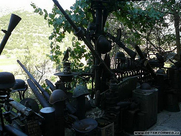Na silnici z Rethimna do Fragokostelo mě upoutala ručně psaná cedule WW2 military museum. Měl jsem dost času, tak jsem odbočil z silnice na prašnou polnačku, která mě vedla skrz polo opuštěnou vesnici. Po cca 1km na mě zpoza zatáčky vykouknul bofors. Na boforsu byla dosti neuměle přivařená zrezlá cedule WW2 museum. Poté co jsem vešel polozbořenými vraty na dvorek jsem málem dostal infarkt. Ke stromu zde byla řetězem připoutaná side k BMW R12, muniční vozík za saharu, protiponorková mina s spousta dalšího materiálu. Myslím že fotky jsou vypovídající dostatečně. NA dvorku přímo u domečku množství válečného materiálu obou válečných stran narůstalo geometrickou řadou. Např: německá protitanková puška, výsadkový kontejner na zbraně i s kompletním obsahem! Norton 16H, části JU 87, protilodní miny, 37mm flak, nějaký horský kanon apod. V malé místnůstce vesnického stavení nás čekal zlatý hřeb. Výsadkové helmy v původní barvě, výsadkové odznaky, nášivky,...