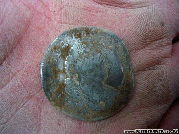Pořádně jsem ji prozkoumal a už vím, že jde o přeražbu ¼ tolaru s osmi korunovanými písmeny L na ¼ tolar s palmami. Do očí bije opis kolem francouzského státního znaku: SIT NOMEN NAV REX BENEDICTVM. Správně to má být SIT NOMEN DOMINI BENEDICTVM. Ve vlasech Ludvíka XIV. je vidět lilie a nad očima panovníka ještě koruna – pozůstatky původní ražby. Mince je bohužel na okrajích zahnutá, ale i tak je to zajímavý nález. Jde o kvalitní stříbro s celkem vysokou ryzostí 917/1000. Pro srovnání – stříbro, z kterého se razily tolary Leopolda I. na začátku jeho vlády, mělo ryzost 875/1000.