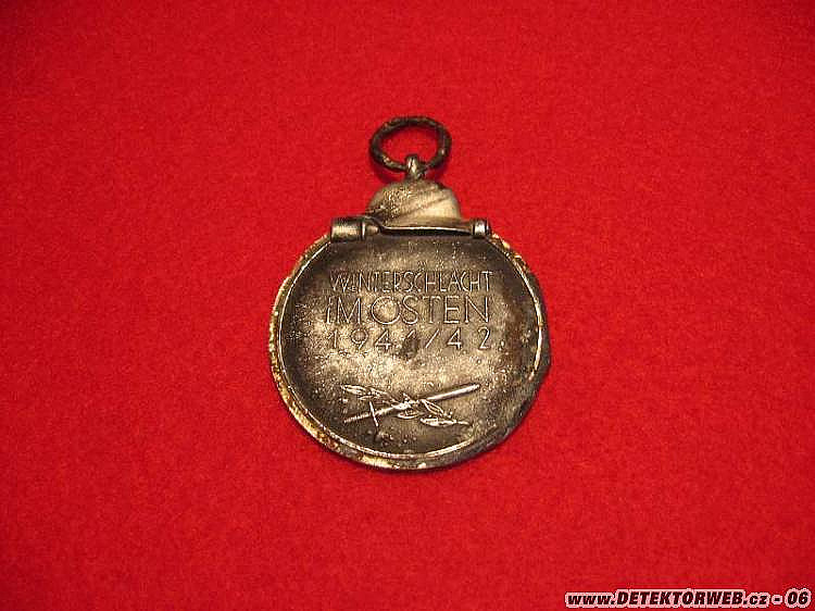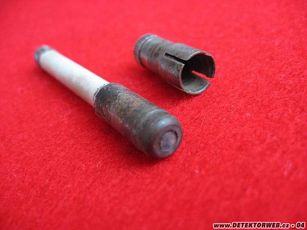 Cestou jsem "hrábl" přívěsky z řetízku (kopačka a míč z 60. let), olověnou kouli z předovky, 1 Kčs z r. 1957 a podobné radosti. Nedalo mi to a tak jsem cestou zpátky zavítal na palouk, kde hvízdá všechno možné na každém metru (alobaly, víčka všeho druhu, dráty, hřebíky, nábojnice aj. ). Jsou tam zbytky lesních bunkrů po mládeži, takže to opravdu hvízdá všude. Jelikož jsem tam ale minule nalezl odznaky z II. sv. války, zatnul jsem zuby a hledal. No a vyplatilo se. Narazil jsem na "hejno racků" od Luftwaffe. Asi půl metru dále jsem objevil knoflík válečného námořníka. Kousek vedle se zase vyklubal "lebkoun" od tankistů (narozdíl od minulého nálezu je tentokrát luxusní). Radost jsem měl z medaile "Za zmrzlé maso", která byla rovněž v tomto prostoru (bohužel, byla v kyselém prostředí pěkně chycená a v lázni pak odpadly okraje, něco s ní ale ještě "podniknu"). Na stejném místě jsem ještě vyhrábl UFO (viz foto s měřítkem). Vypadá to jako zvláštní druh nějaké el. pojistky, ale také by to mohla být klidně i roznětka?