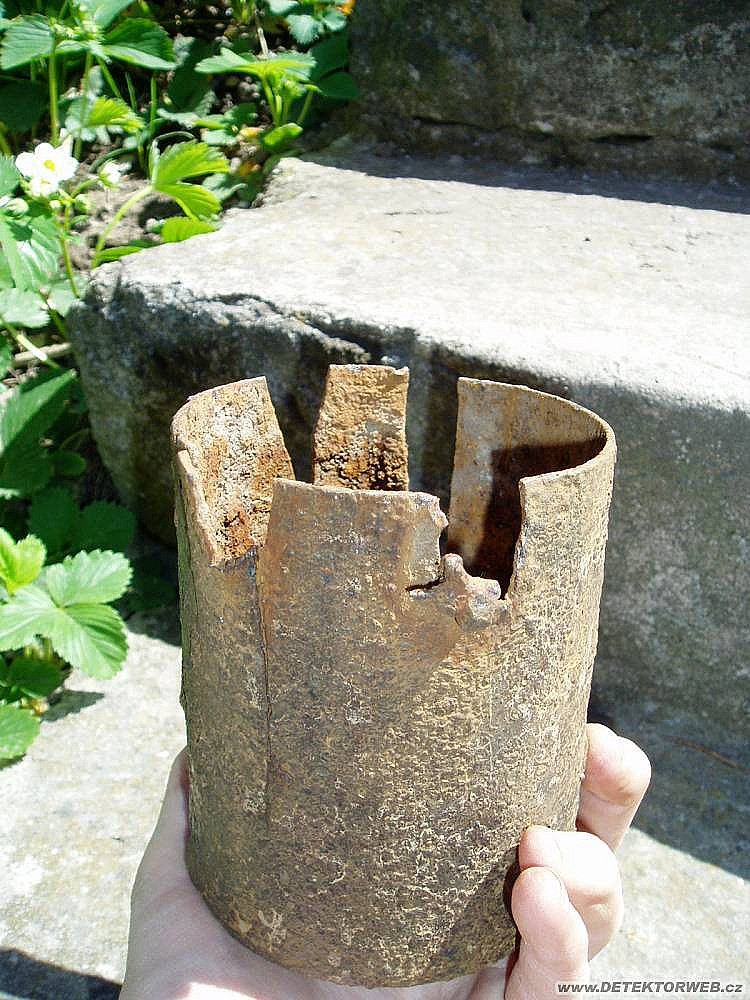 04. 05. 2007, 10:32Je to vnější obal od německé protipěchotní miny S-Mine-35. Ty 3 dírky na dně pomocí šroubků zajišťovaly vnitřní pouzdro proti vypadení. Ten plíšek uvnitř značí, že byla aktivována a vnitřní pouzdro bylo vystřeleno nad povrch, kde došlo k explzi. Ten plíšek totiž kryl na vnitřním pouzdře otvor ve kterém byla výmetná náplň (černý prach).