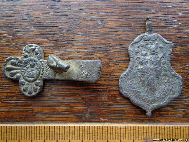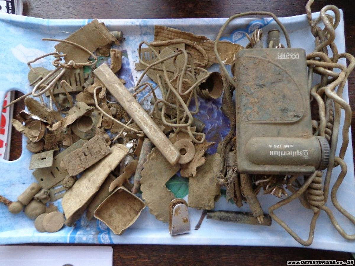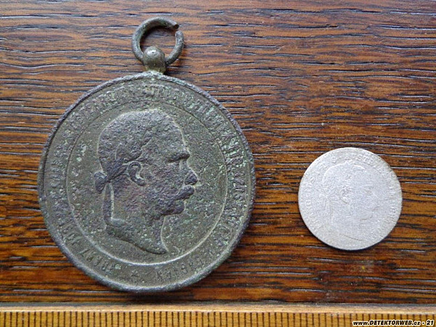 Tak jsme vyrazili oblíbeným směrem. Mamka, Zelík, Jarda64, Houmr a moje drobnost. První lepší signálek byla klasicistní botovka s rohovými rokaji, vzápětí F. J. I. medaile "Prosinec 1874". Zelík do toho šla po hlavě, viz foto. Pak se trošku zadařilo války. Puštička, na to, že ležela v dřívějším poli, je v kondici a udělala radost. Kousek od ní ležel ten zbytek IDčka, SS- Kavalerie. Číslo je 5 tisíc a něco, nejspíš další absolvent Benešovské školy. Mamka si kopla Ag deseti krejcárek a další barokní svátostku do sbírky. Počasí přálo a po téměř sedmi hodinách courání byla spokojenost na místě. Pokud někdo pozná ten vykouslý měďák, budeme rádi za info.