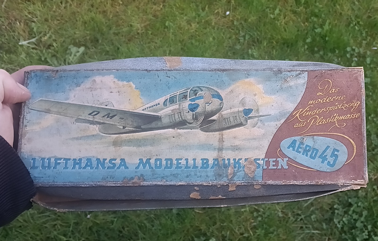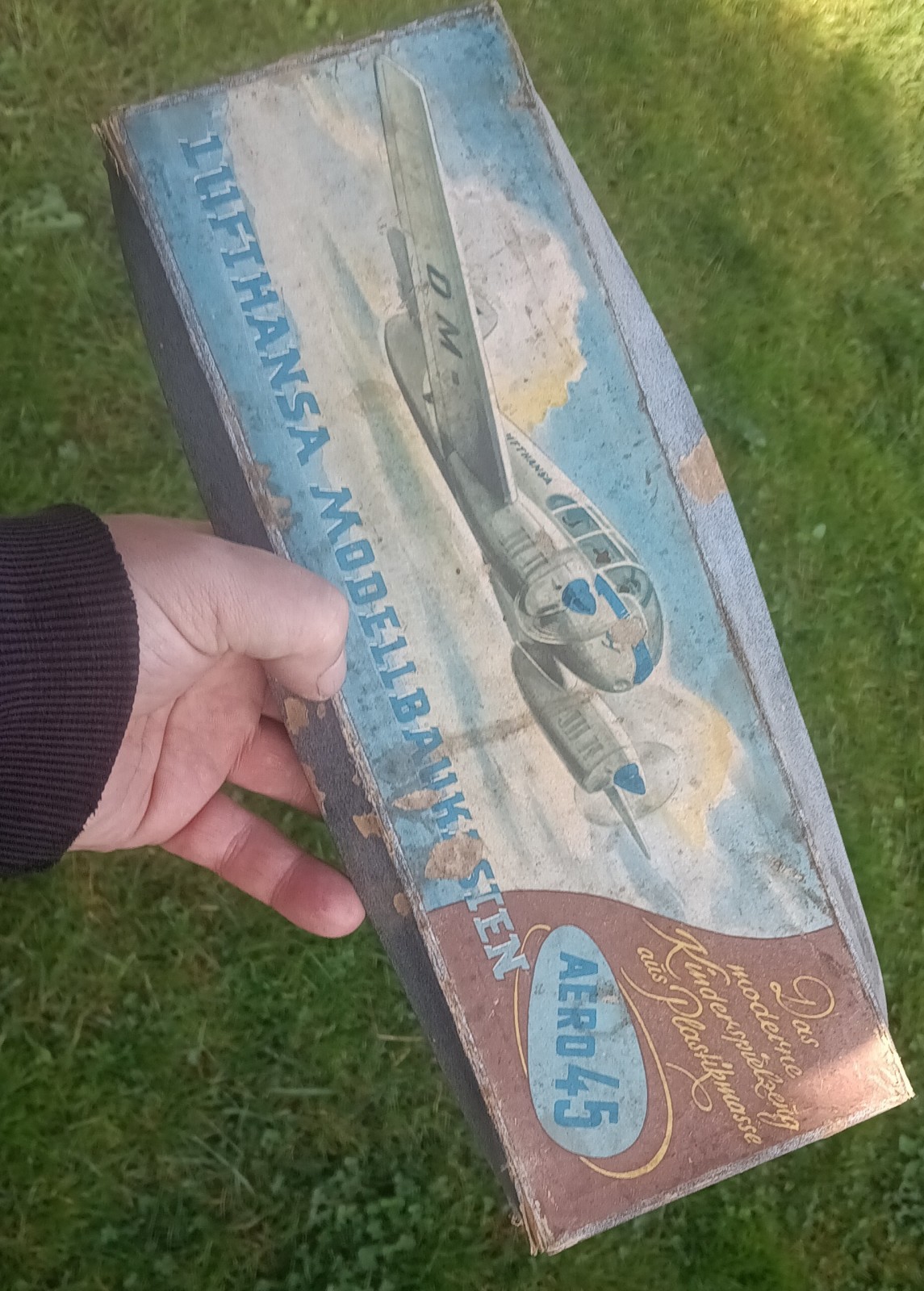 Stará krabica s modelu lietadla, škoda toho stavu.