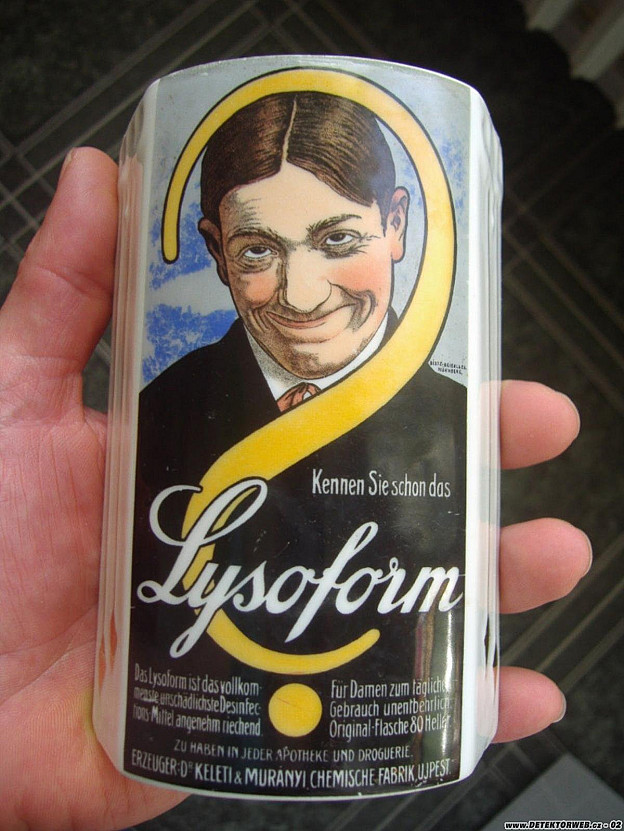 Posílám jeden z nálezů ze staré skládky. Jedná se o reklamu na Lysoform z dob RU cca 1910. Dohledal jsem, že se jedná o maďarského herce: Gyula Hegedűs. Vyhledal jsem i stejnou reklamu: plakát a známky na dopis, ale porcelánový předmět, jaký mám já, jsem nedohledal. Je možné, že to mohlo být lékárně nebo drogerii zavěšené a uvnitř ty reklamní letáky...