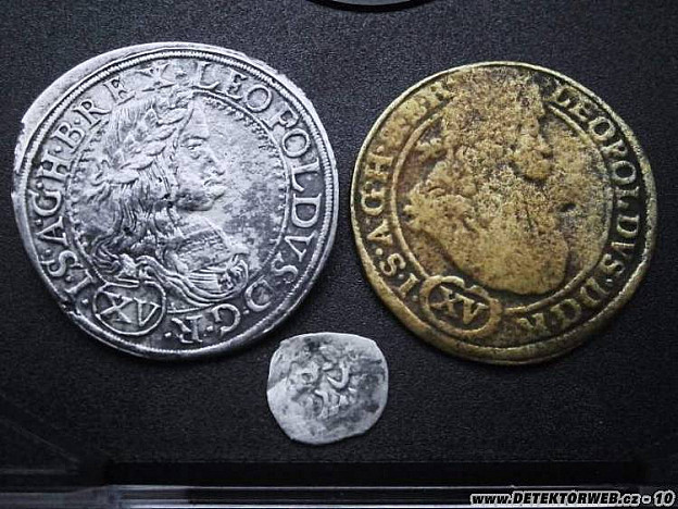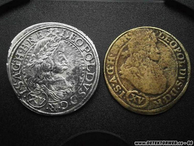 Bylo celé zelené a vypadalo jak starý sežraný měďák. Lehce jsem ho otřel o kalhoty a ejhle hrana byla světlá. Za mohutného výkřiku "Mám ho"a Slušné dávce adrenalinu z toho nálezu jsem se pokusil trochu zjistit co je to zač. Po nekonečném zvlhčování slinami a třením o košili se na okraji ukázal kousek opisu, bylo tam Leopold a dole XV. Po tomhle zjištění následovala další mnohem větší dávka adrenalinu do žil. Konečně se mi povedlo kopnout dlouho vysněnou minci. Po dohledávce okolí jsem asi metr vedle našel tu malou minci. Spokojený z nálezem jsem se začal vracet zpět. Několik málo metrů od místa nálezu pečetítka na mě ještě vykouklo další mincovní závažíčko.